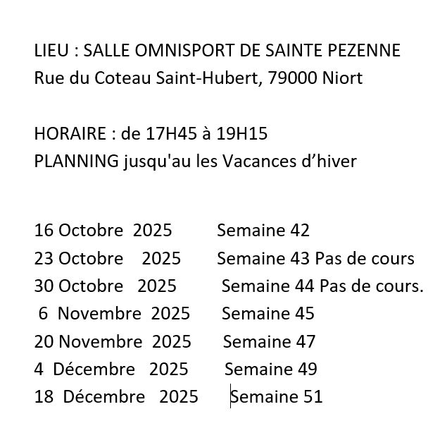 ACCUEILPlanning cours technique jusqu’à 18 Déc 2025 par tkdclub.niort@gmail.com•Publié le 26 septembre 2025 Navigation de l’article PrécédentNoah GARCIA au L’international Dutch Open