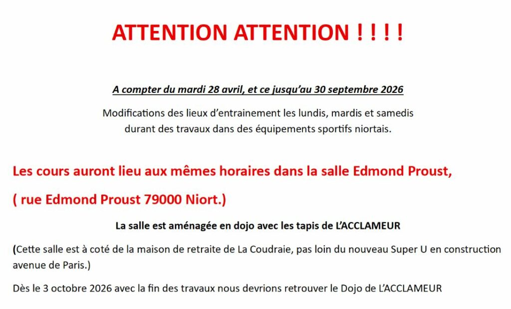 ActualitésTRAVAUX AU DOJO DE L’ACCLAMEUR par tkdclub.niort@gmail.com•Publié le 21 avril 2026•0 Commentaire(s) Navigation de l’article PrécédentNOAH GARCIA médaille d’Argent Laisser un commentaire Annuler la réponseVotre adresse e-mail ne sera pas publiée. Les champs obligatoires sont indiqués avec *Votre commentaireVotre nom * Votre e-mail * Votre site Enregistrer mon nom, mon e-mail et mon site dans le navigateur pour mon prochain commentaire.
